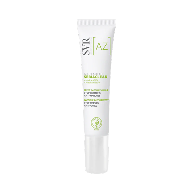 Le SVR SEBIACLEAR Gel Flash 4H Stop Boutons 15 ml réduit boutons, rougeurs et excès de sébum dès 4 heures, grâce à l’acide azélaïque & niacinamide – invisible & compatible maquillage.